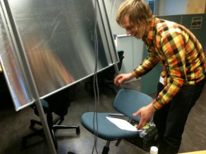 Sääntönä oli, että videon tulee vastata julkista esiintymistilaisuutta, eli sitä ei voi koostaa pätkistä tai ryydittää erikoisefekteillä. Vaikka kaksi minuuttia on lyhyt aika, vaati onnistuneen esityksen purkittaminen yllättävän monta ottoa, mutta oli projektina varsin hauska. Käyttäen jalustan tukena vanhaa pöytäkonetta ja läjää Xbox-pelikoteloita saatiin kamera kohdistettua niin, että telkkarin edessä vedetty puhe vastaa lähes green screen -tuotosta. 🙂